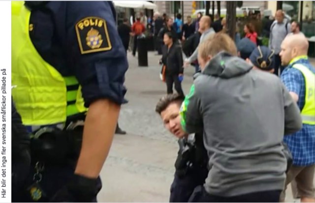 Ett bildspel i en artikel i Aftonbladet visar samtidigt en person med samma väska och kläder som på bilden ovan som omhändertas av polis.