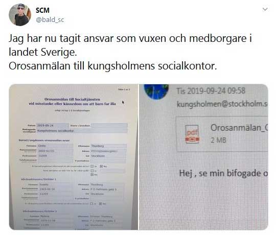 Idag har en privatperson gått ut på Twitter med bilder på en orosanmälan som gäller Greta Thunberg. Enligt personen ska anmälan ha skickats till Kungsholmens socialkontor i Stockholm. Som bevis på detta finns även en skärmdump bifogad som visar att ett mejl med en fil som heter ”Orosanmälan_Greta” skickats till stadsdelsförvaltningen i morse: