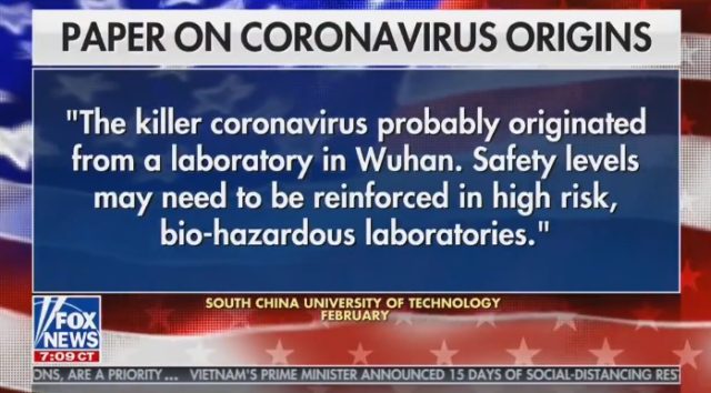 I ett inslag på Fox News talar Tucker Carlson om en hittills okänd kinesisk rapport från februari där man konstaterar att coronaviruset inte kan ha kommit från marknaden i Wuhan, Kina som det påstås då fladdermöss överhuvudtaget inte såldes där, utan från ett av två närliggande laboratorium där man utförde tester med just dessa djur.
