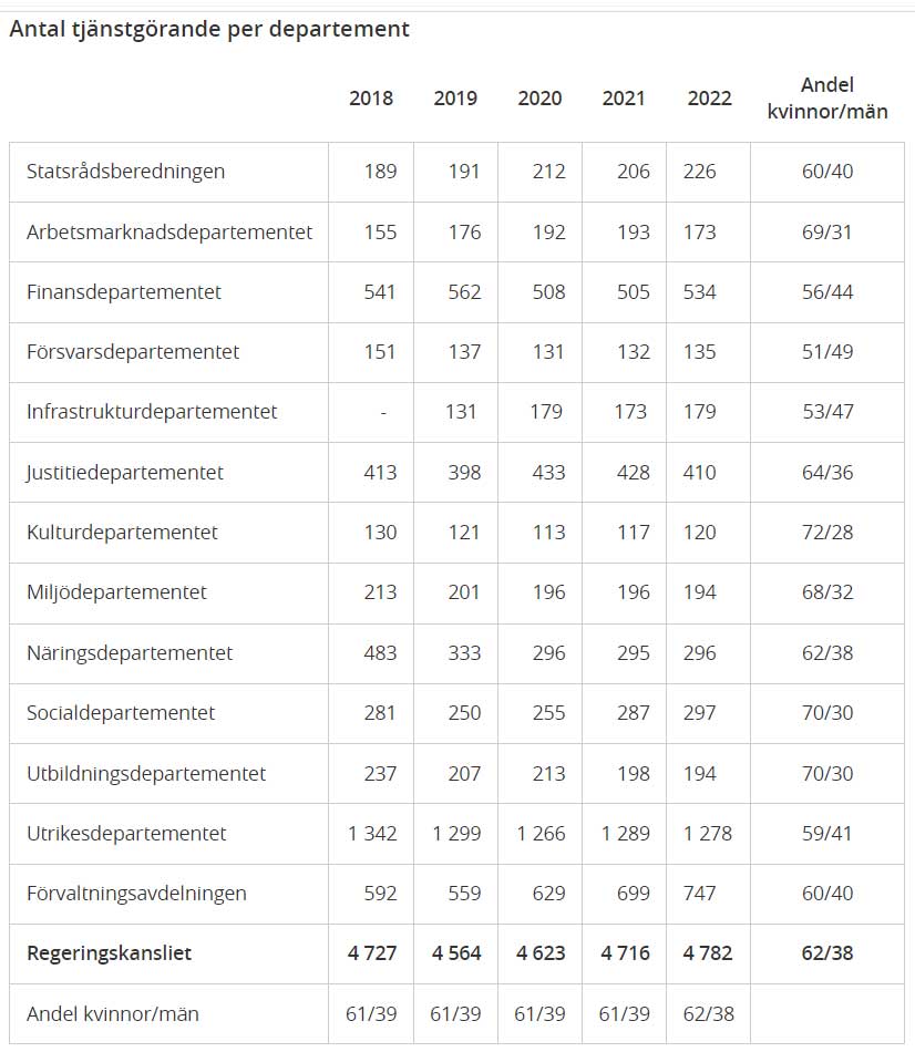 Regeringskansliets skeva könsfördelning med stor kvinnlig övervikt i kombination med att drygt 4 800 av 5 000 anställda domineras av vänstersinnade och sitter kvar oavsett vilka partier som innehar regeringsmakten, gör det mycket svårare för borgerliga/socialkonservativa regeringar att verkställa sin politik än för rödgröna dito. Att det genomgående ser ut på det sättet också på andra myndigheter och institutioner gör uppförsbacken än brantare.