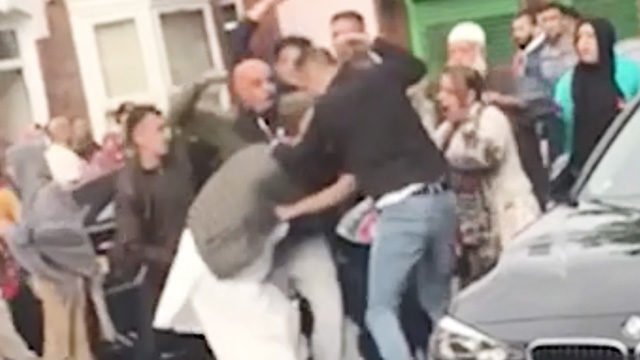 I en video, publicerad av Daily Mail, ses två män sammankopplade i vad som kan beskrivas som en våldsam dragkamp samtidigt som flertalet runt dem delar ut slag efter slag. En äldre man i stort vitt skägg ses koppla grepp på en yngre storväxt man. Skrikande kvinnor tränger sig genom folkmassan och försöker sära på männen medan slagen haglar.