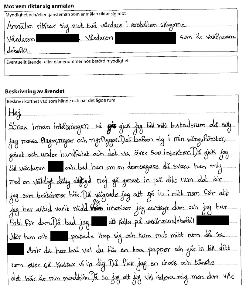 21-åringen påstår i sin anmälan att det funnits ”över 500 insekter” i cellen, men att han vare sig fått låna en dammsugare för att städa rummet eller fått sova i en annan cell. ”Jag har alltid varit rädd för insekter”, skriver han.
