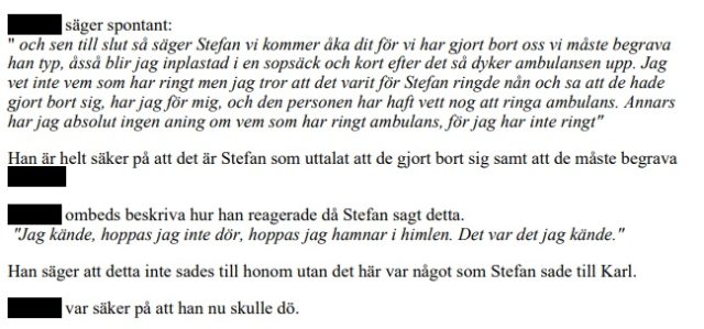 Brottsoffret berättar i polisförhör hur gärningsmännen pratat om att begrava honom. I den stunden ska brottsoffret ha reagerat på samtalet genom att tänka, ”hoppas jag inte dör, hoppas jag hamnar i himlen”.