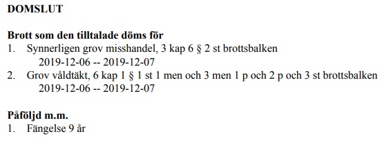 Bergqvist och Karlsson döms till fängelse i nio år och de ska solidariskt betala skadestånd till brottsoffret motsvarande 329 000 kr jämte ränta på beloppet från den 7 december 2019 till dess betalning sker.