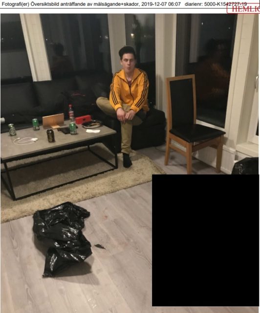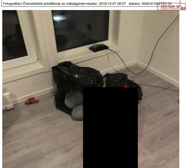 När polisen klev in i fastigheten befann sig gärningsmannen kvar på platsen sittande i soffan och tittade på offret som låg i en plastsäck. Nedan syns Bergqvist i soffan och bakom maskningen syns brottsoffret liggande i fosterställning enligt polispatrullen.