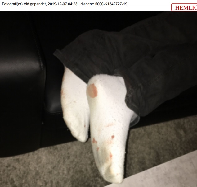 Karlsson påträffades sovande i soffan med blodspår på strumporna. Det framgår av polisrapporten att Karlsson misstänkts ha fejkat sömn när polisen klev in i fastigheten.