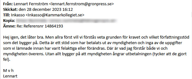 Ägaren Lennart Fernström bestrider i mejl till Kammarkollegiet återbetalningskravet, och undrar ”vilket författningsstöd som det bygger på”.