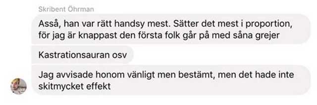 Tänk om det varit en Sverigedemokrat som var ”handsy” med Öhrman. Hade hon då bara ”avvisat honom vänligt men bestämt”? Eller skrivit flera obetalda krönikor om hur alla vita män är våldtäktsmän som gillar att feltolka statistisk om våldtäkter för att skuldbelägga främlingar? Vi får aldrig veta vad hon hade skrivit om det varit någon till höger om Centerpartiet som trakasserat henne. Trots allt är han hennes chef ”god”.