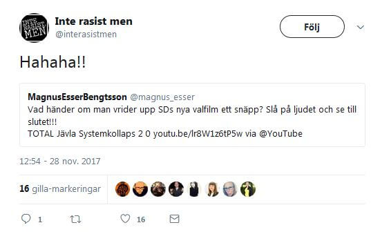 Den vänsterextremistiska bloggen som påstår sig ”granska” Sverigedemokraterna spred igår en video där SD:s senaste valfilm som innehåller bildsekvenser från terrordådet på Drottninggatan i våras och skottlossningar i utsatta områden kompletteras med bilder och ljud från zombiefilmer. IRM menar att filmen med rubriken ”Total Jävla Systemkollaps 2 0” ska föreställa satir och håna Sverigedemokraternas världsbild: