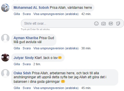 Aktörerna bakom moskén har publicerat ett Facebookinlägg för att meddela församlingsmedlemmar om nyheten. Flera personer skriver på arabiska ”prisa Allah”. En person kallar Allah för ”världarnas herre”