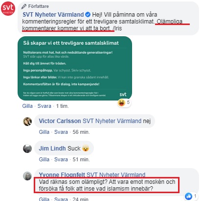 När statstelevisionen publicerat nyheten om klartecken för jättemoskén i Värmland var man orolig över att folk skulle uttrycka sig kritiskt om islamiseringen. Därför påminde man särskilt om gällande kommenteringsregler.