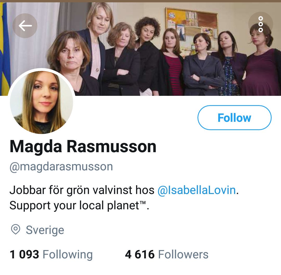 Människorna som har satt igång allt detta verkar dock inte känna någon ånger överhuvudtaget. De är stolta över vad de har åstadkommit. Här använder statssekreteraren Magda Rasmusson bilden som bakgrundsbild på sin Twitter-profil. Hon är en av personerna på bilden och ser tydligen detta som en av sina höjdpunkter i politiken: