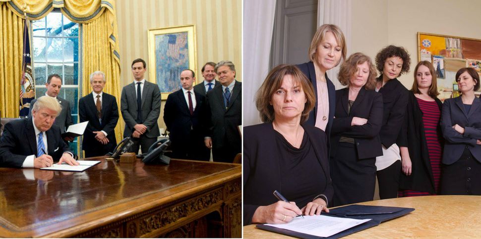 I ett inlägg på Twitter publicerades en bild på kvinnliga ministrar i den feministiska regeringen som en parodi på ett foto där Trump signerade exekutiva ordrar med flera manliga rådgivare bakom sig.  Sedan skedde precis vad ministrarna tydligen hade hoppats på – bilden blev viral och återpublicerades av de största vänsterliberala medierna. Därmed var saken klar – Sverige hade blivit ett slagträ i den amerikanska politiken.