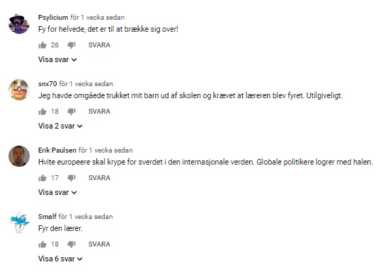 Kritiseras som koranskola Videoklippet har väckt ilska hos danskarna som bland annat kallar skolan för en koranskola, kräver att läraren avskedas och menar att detta är indoktrinering av barn. Ytterligare personer kallar händelsen ironiskt för ”kulturberikning” medan andra talar om ett land som håller på att kollapsa.