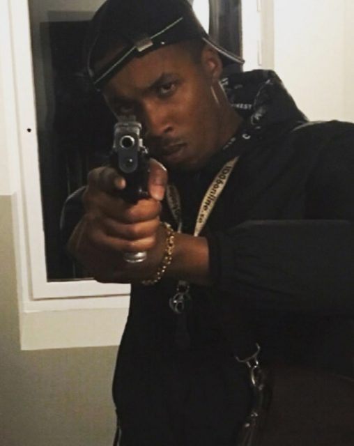Rapartisten Jaffar Byn syns bära en vit tröja och posera med automatvapen. Foto: Polisen