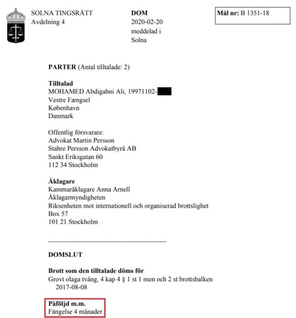 Mustafa Mohamed (Musse) dömdes senast den 29 mars 2019 för synnerligen grovt narkotikabrott till fängelse i sju år och fyra månader. Det framgår av domen att tingsrätten har sett till att påföljderna tillsammans inte överstiger vad som skulle ha dömts ut för den samlade brottsligheten om allt hade prövats vid samma rättegång.