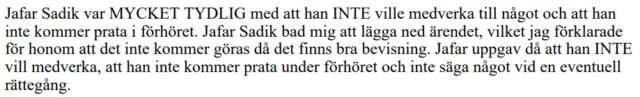 Det framgår av polisutredningen rörande förnedringsvåldet mot Sadik att han själv inte ville medverka i målet. Därför har inget förhör har hållits med honom.