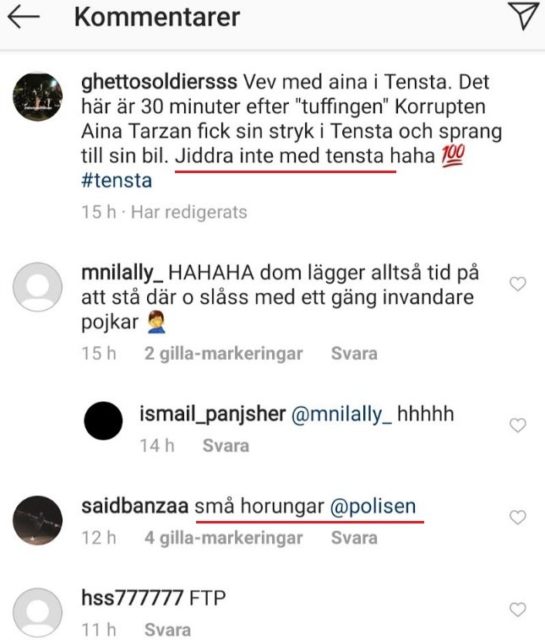 ”Jiddra inte med Tensta” I ett kommentarsfält till videoklippet skriver signaturen ’ghettosoldiersss’ ”jiddra inte med Tensta”. I en annan kommentar kallas polisen för ”horungar” med tillägget ”FTP”, förkortning för ”Fuck the Police”.