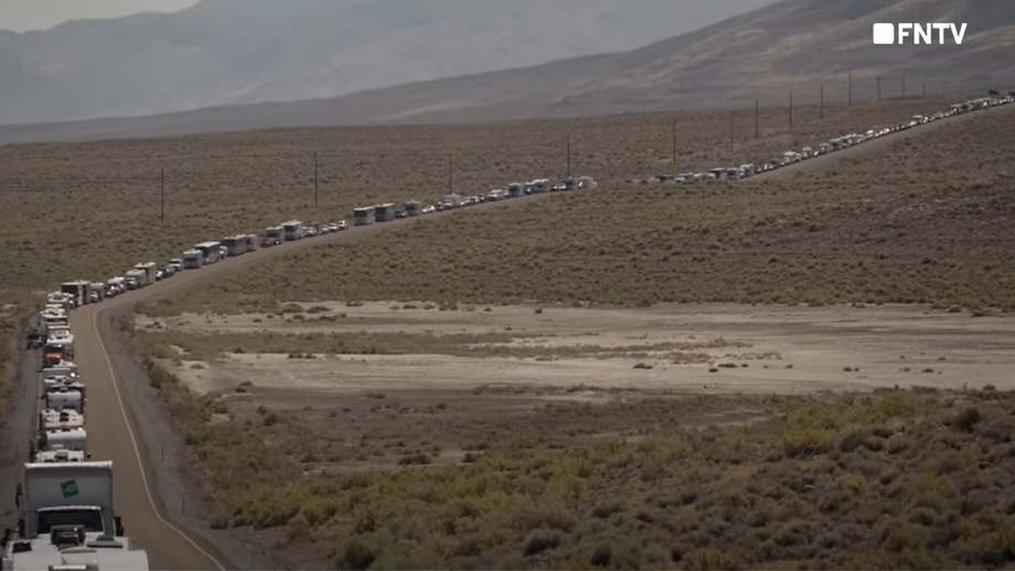 Det är på en landsväg i Nevada, USA som några klimatextremister spärrade av vägen med ett underrede till ett släp eller lastbil samt skyltar med texten ”Burners of the world unite” samt ”General strike”. Deras tilltag orsakade köbildning som ser ut att vara väldigt lång.