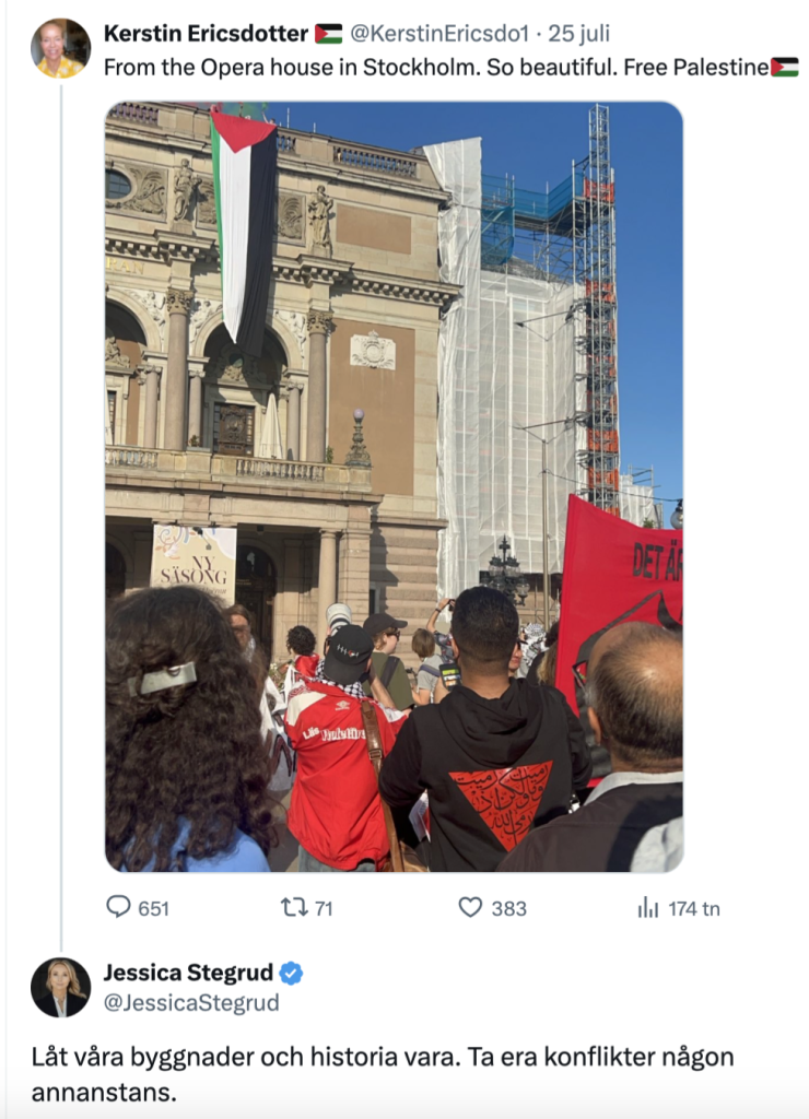 En som har reagerat på inlägget är Jessica Stegrud, tidigare SD:s EU-parlamentariker och numera riksdagsledamot, som skriver att demonstranterna ska låta våra byggnader och vår historia vara. ”Ta era konflikter någon annanstans”, avslutar hon.