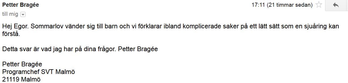 På vår följdfråga Gällande huruvida Bragée anser att den låga åldern på tittarna legitimerar vilseledande om yttrandefrihetsbegreppet svarar han följande: