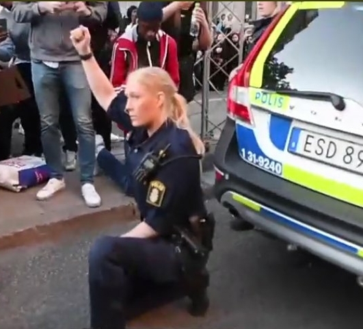 Klippet uppges visa samordnad kommunikation mellan poliskvinnan och demonstranter som sedan tillsammans rör sig mot en radiobil där hon inför gruppen fäller in sin batong och går ned på knä, knyter näven i en svart makt-gest och håller upp ett plakat med kollektiva anklagelser mot vita. Samhällsnytt har talat med poliskvinnan som trots ett femtiotal JO-anmälningar fortfarande svarar på sitt arbetsnummer.