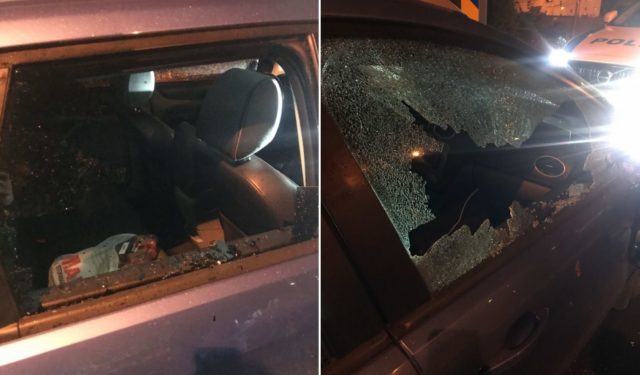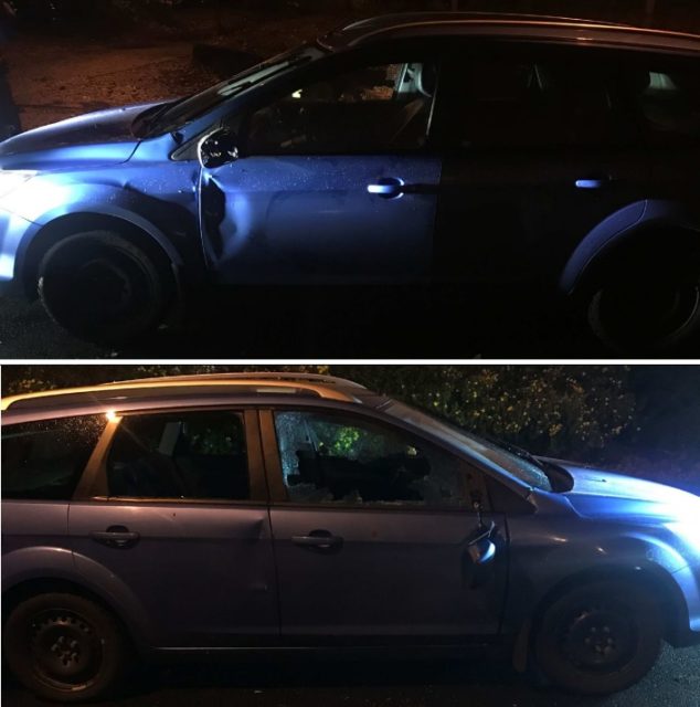Polisen gjorde brottsplatsundersökning på mannens bil. Fönsterrutor var krossade och sidospeglarna var trasiga, samt flera bucklor förekom.