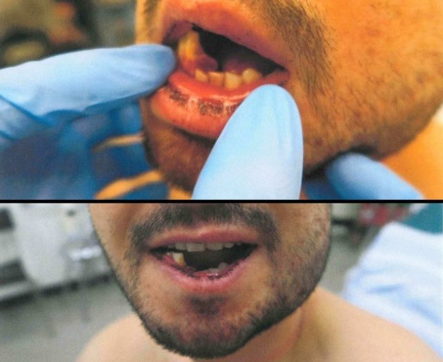 Målsägaren är uppenbart mycket chockad och har kraftiga skador mot ansiktet och käken. Käken ser ut att vara av på minst ett ställe och hela tandraden har förflyttat sig.