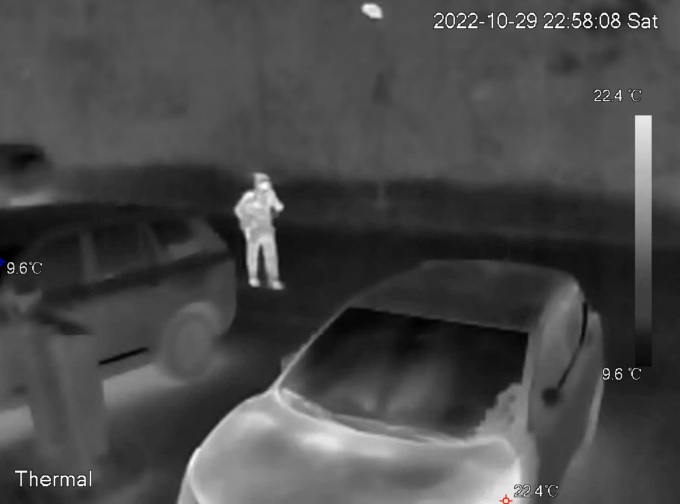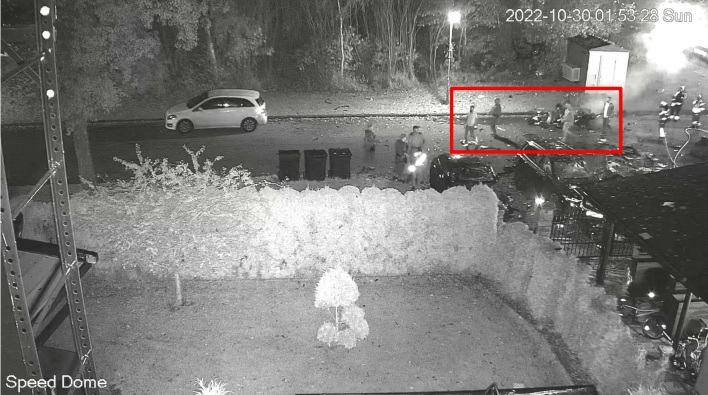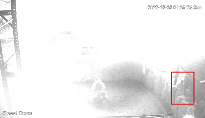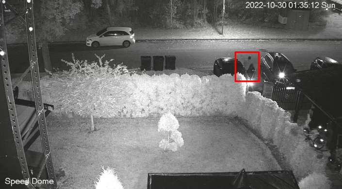 Hela händelseförloppet vid bombdådet fastnar på film eftersom företagaren har flera övervakningskameror på villatomten. En mörklädd man syns dyka upp på adessen och lämnar en ryggsäck under familjens Nissan-bil för att sedan jogga iväg från platsen.