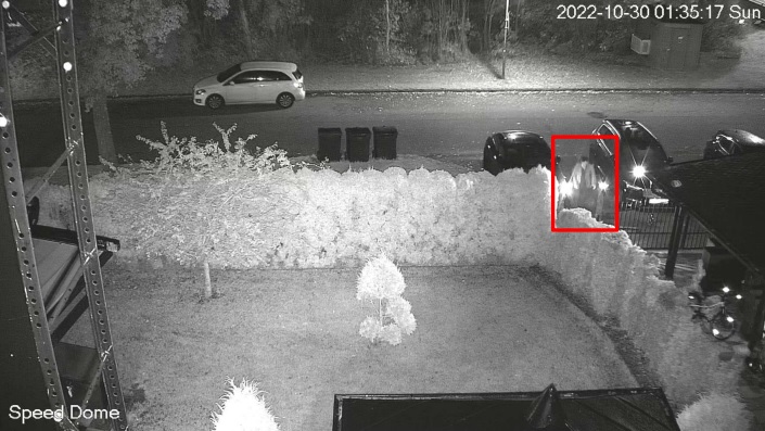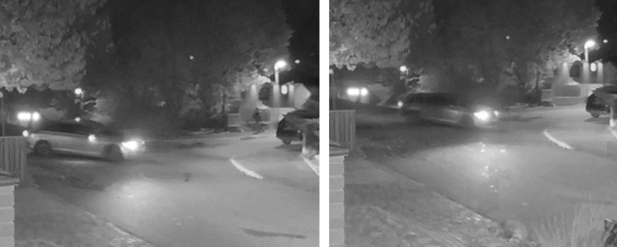 En person som polisen pratar med på platsen säger sig ha sett flera personer med rånarluvor lämna området i en silverfärgad Volkswagen Passat. En övervakningskamera vid en annan bostad fångar också bilen.