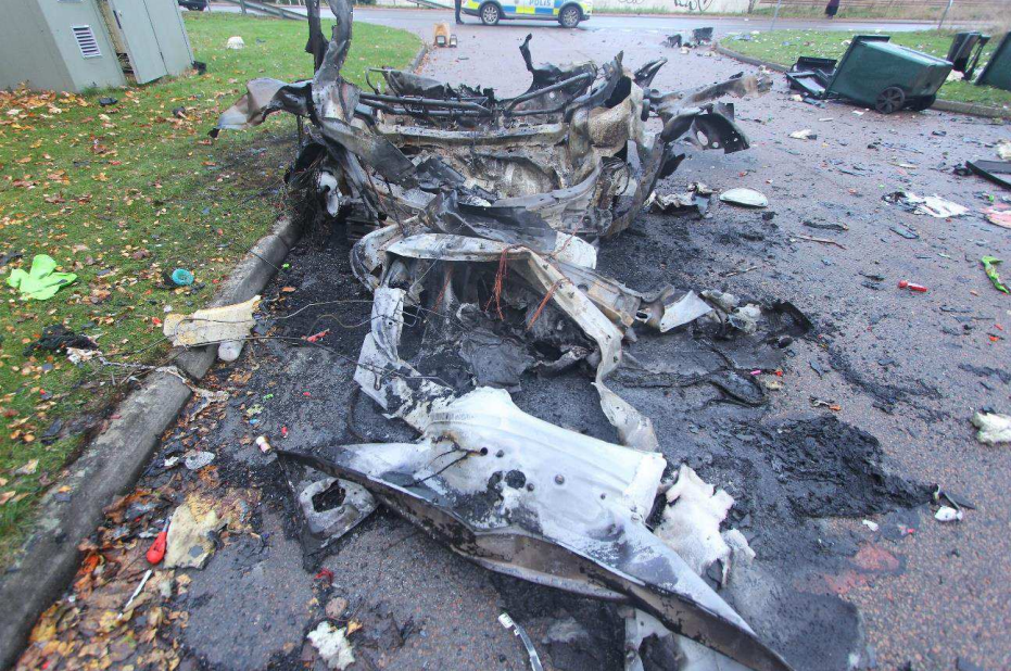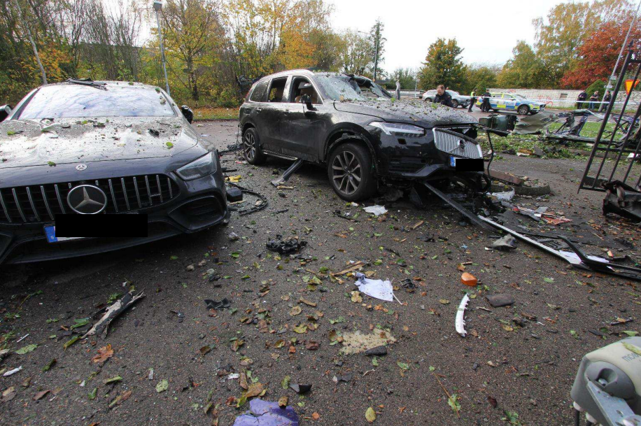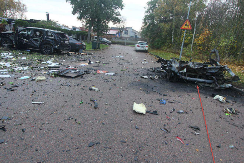Vidare har syns stora skador på både fastigheten och övriga bilar på parkeringen. Det framgår av polisutredningen att bomben ska ha varit på 3-5 kilo och fjärrutlöst via en mobiltelefon.