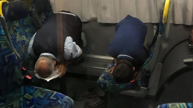 Det var strax innan avgång som en kvinnlig resenär upptäckte hur chauffören inne i bussen förrättade muslimsk bön tillsammans med två yngre pojkar. När kvinnan som kände sig otrygg i mörkret utanför bussen knackade för att få stiga på vägrade chauffören att släppa in henne.