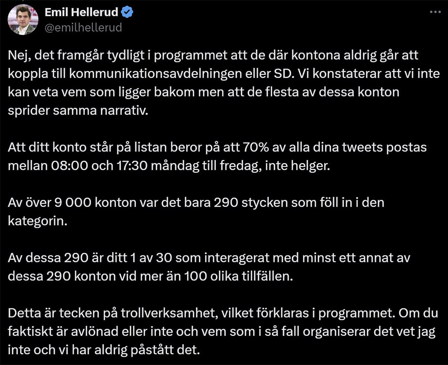 Hellerud fortsätter med att hävda att om 70 procent av inläggen för dessa konton ”postas mellan 08:00 och 17:30 måndag till fredag, inte helger” samt om ett konto ”vid mer än 100 olika tillfällen” interagerat med andra liknande utpekade konton, så är det tecken på organiserad ”trollverksamhet”.