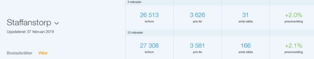 I början av februari presenterade Svensk Mäklarstatistik nya siffror som visar en ökning av villapriserna i Staffanstorp med 2,0 procent de senaste tre månaderna. Detta samtidigt som priserna generellt sjunker i Skåne, -0,8 procent, och i hela landet -3,0 procent.