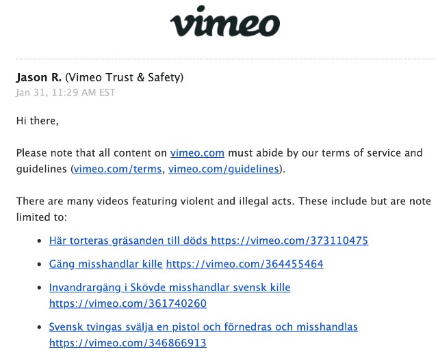Vimeo tillåter med andra ord inte en intervju med Tommy Robinson, en dokumentär om utsatta svenskar i Kil och tolererar inte att vi avslöjar rasism hos en rapartist, eller uppmärksammar förnedringsvåld mot svenska ungdomar.