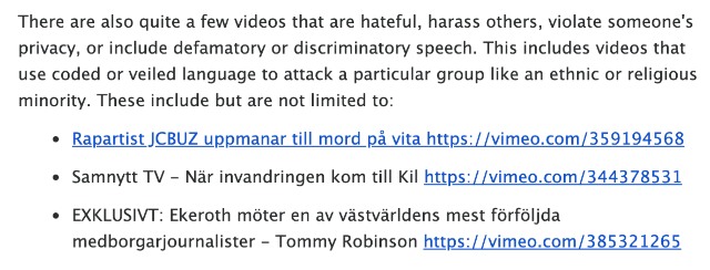 Det är också många videos som är hatfulla, trakasserar andra, kränker någons integritet eller inkluderar kränkande eller diskriminerande tal. Detta inkluderar videos som använder kodat eller förtäckt språk för att attackera en viss grupp såsom en etnisk eller religiös minoritet. Detta inkluderar men är inte begränsade till: – Rapartist JCBUZ uppmanar till mord på vita https://vimeo.com/359194568 – Samnytt TV – När invandringen kom till Kil https://vimeo.com/344378531 – EXKLUSIVT: Ekeroth möter en av västvärldens mest förföljda medborgarjournalister – Tommy Robinson https://vimeo.com/385321265