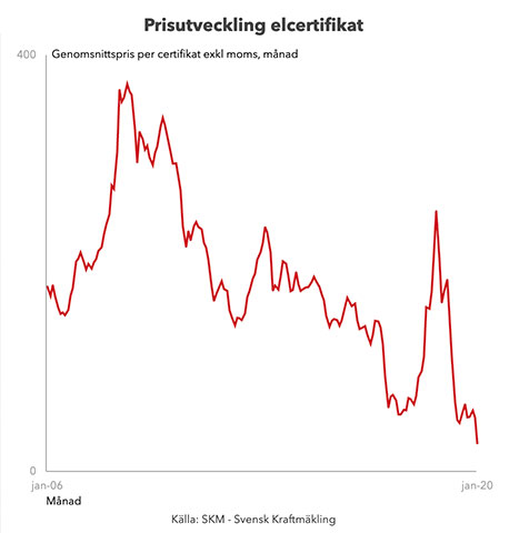 Elcertifikaten har tilldelats i paritet till kraftverkens produktion. Precis som för den faktiska elen finns det en marknad för elcertifikat, även de priserna är idag i lägre än någonsin. I januari kostade ett elcertifikat i snitt 26,40 kronor, enligt Ekonomifakta. Det är hela 86 procent mindre än under samma månad året innan.