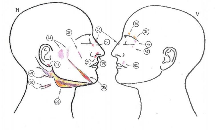 En karta med skador på offrets ansikte och hals (Polisens FUP)