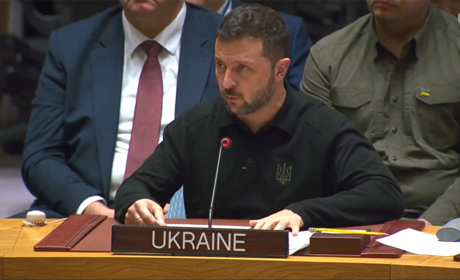 Under tisdagen adresserar Zelenskyj FN:s säkerhetsråd. I sitt tal anklagar han Ryssland och den ryske presidenten Vladimir Putin för ”krig och terror” och för att begå ”internationella brott”.