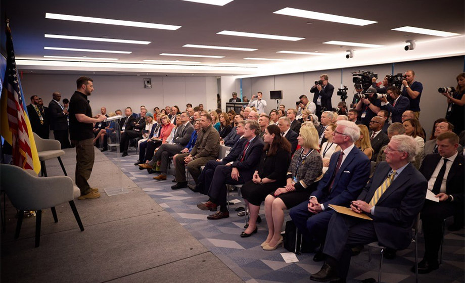 – Ryssland använder 300 stridsplan på ukrainskt territorium varje dag. De har fler, men de använder 300, säger den ukrainske presidenten på en fråga efter sitt anförande och tillägger: